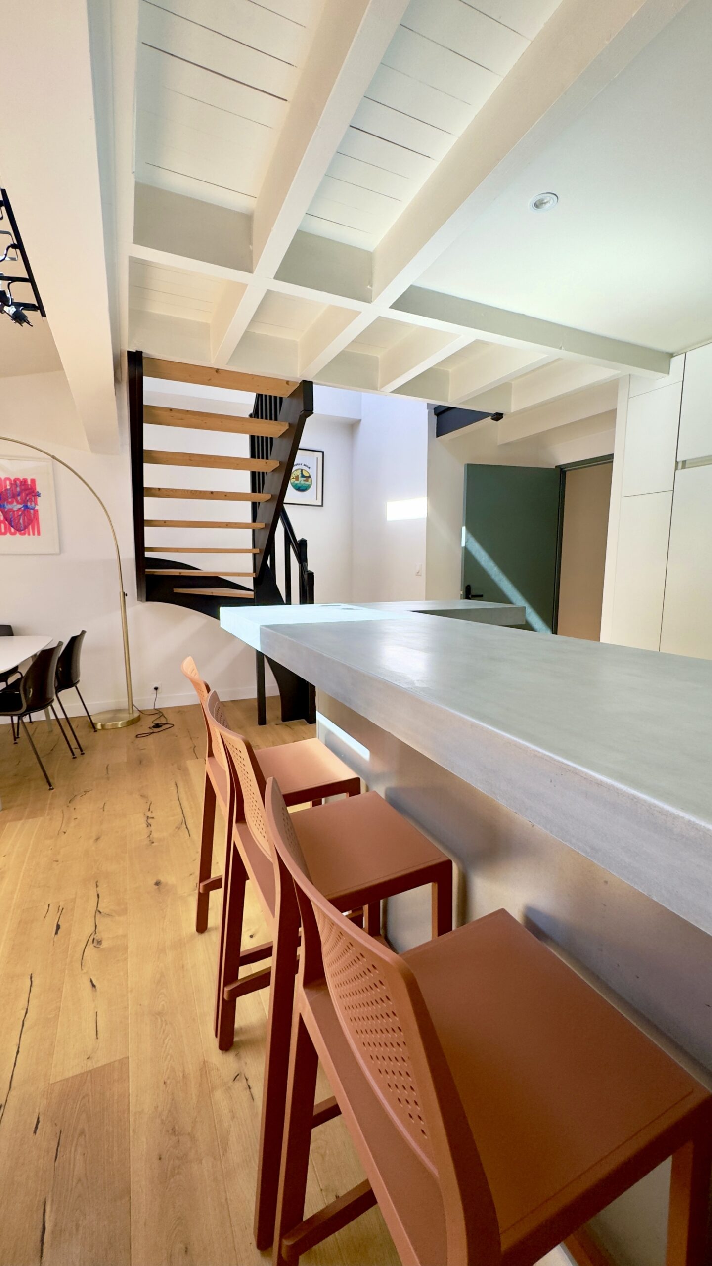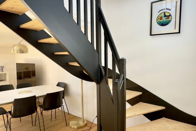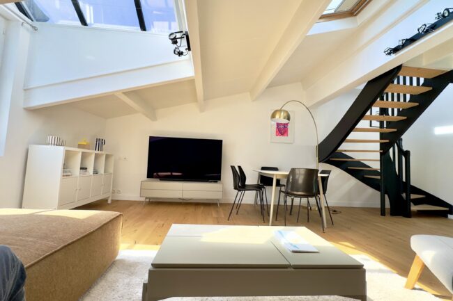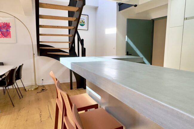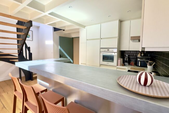 Au 1er niveau, vous profiterez d’une vaste pièce de vie de près de 40 m², ouverte sur une cuisine contemporaine, ainsi qu’une chambre donnant sur cour, avec une salle d’eau indépendante.