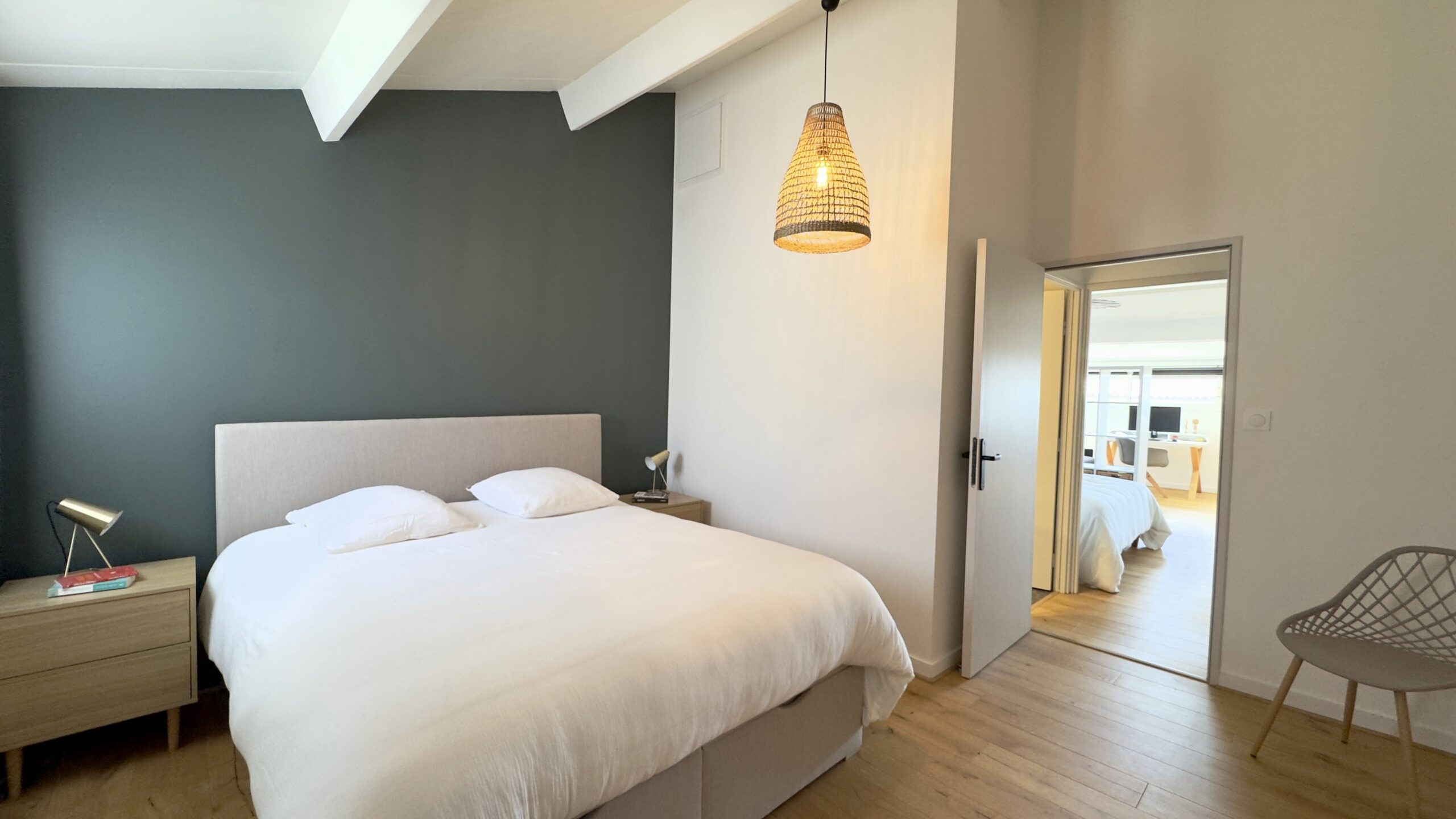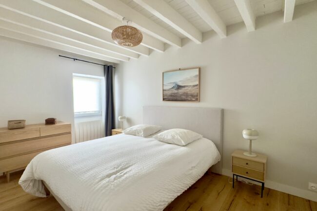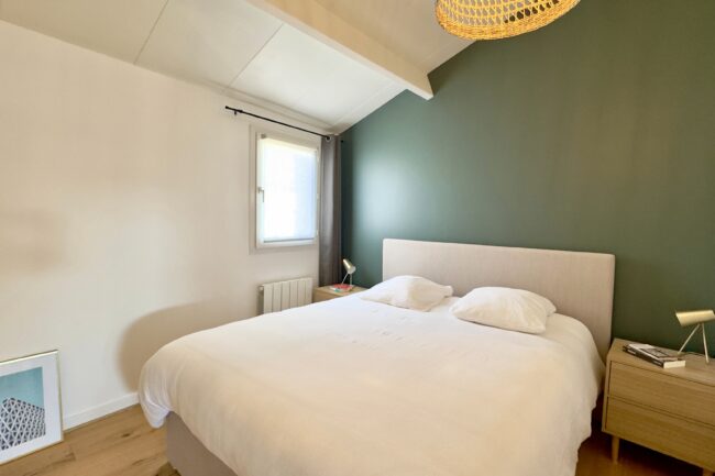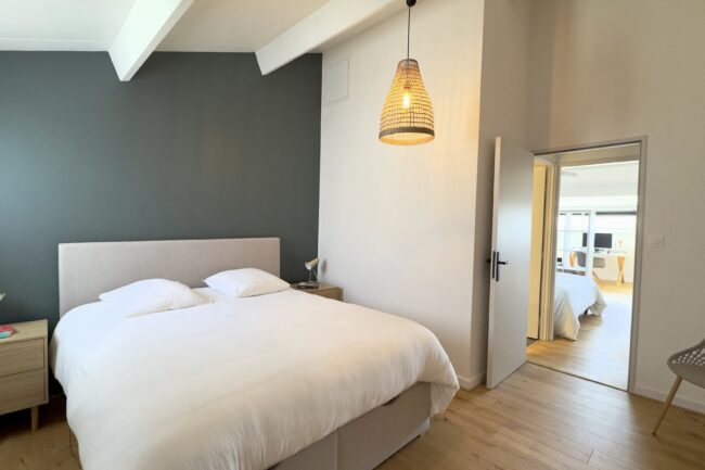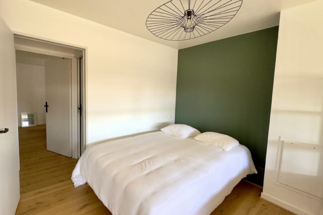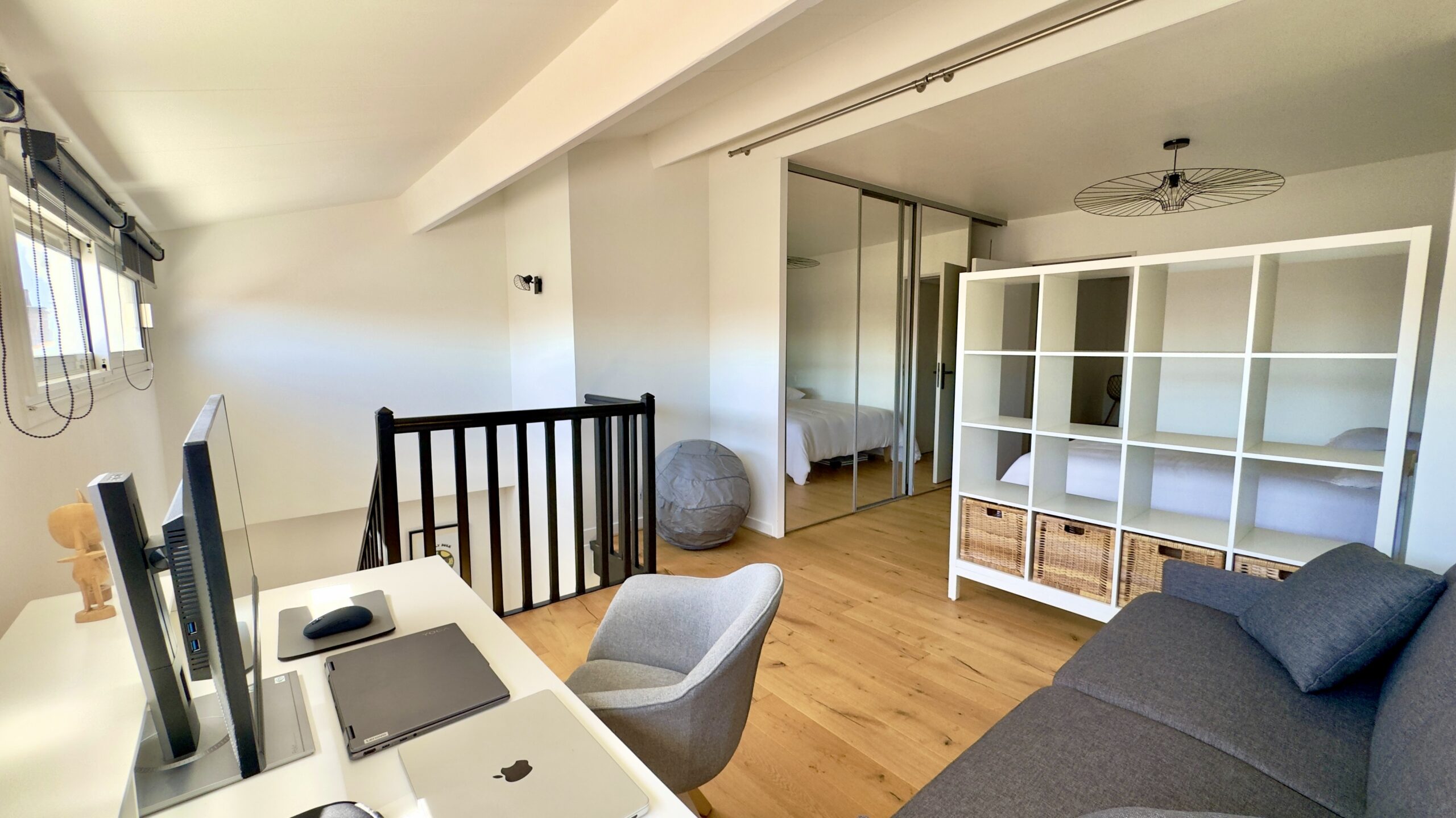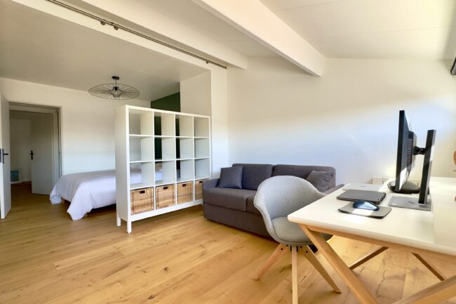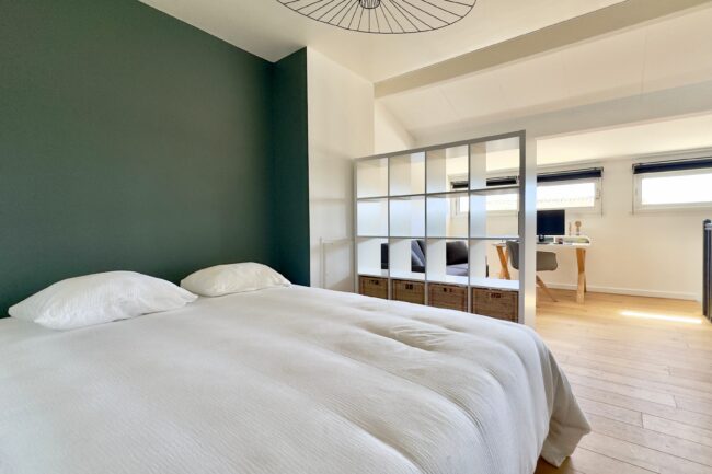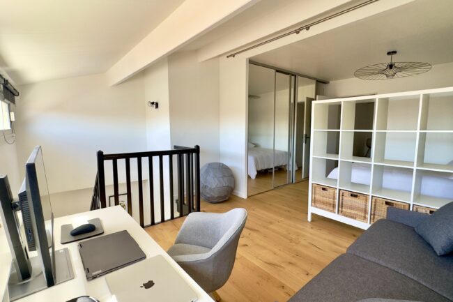 À l’étage, un grand palier distribue une seconde chambre, avec la possibilité d’aménager un coin bureau en troisième chambre.
